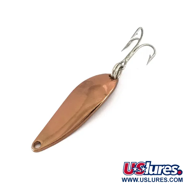 Les tons cuivrés dominent la finition de ce classique de fabrication américaine, un choix de couleur souvent privilégié pour sa visibilité dans les eaux teintées ou par temps couvert. Pesant seulement 1/8 oz (3,4 g), l'Acme Fiord Spoon Jr, identifié par le code produit 7787, est un outil spécialisé pour le lancer ou le jigging vertical ciblant les prédateurs méfiants. Mesurant 1 1/2" (3,5 cm), le corps métallique présente un profil allongé distinct que les collectionneurs reconnaîtront comme un design vintage de chez Acme, aujourd'hui hors production. En retournant le leurre, on découvre l'estampille « FIORD Jr. » sur le côté concave, proprement pressée dans la surface en cuivre. Ce spécimen particulier conserve un excellent état de conservation (5/5), la finition métallique et l'armement restant brillants. Un simple anneau brisé relie l'hameçon triple piquant à la queue, tandis que l'œillet à l'avant est exempt de toute obstruction.