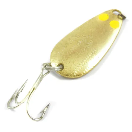 Un plaquage en or et une finition texturée en écailles définissent le profil visuel de cette cuillère Glen Evans 576. Deux points jaunes distincts sont situés à l'extrémité large du corps, offrant un contraste de couleur net avec la surface métallique. Le revers comporte un marquage clair identifiant la marque Glen Evans et le numéro de modèle 576, confirmant sa fabrication américaine. Ce spécimen mesure 4 cm (1 1/2") et pèse 5,5 g (3/16 oz), avec un état de conservation de 4/5 et des surfaces bien préservées. L'armement comprend les anneaux brisés d'origine pour l'attache de la ligne et un hameçon triple fixé à l'extrémité étroite, le tout répertorié sous le code produit 3245.