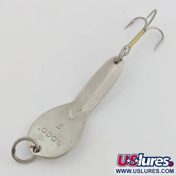 Clairement estampillée « LOCO » 2 au revers, cette cuillère de 1/4 oz (7 g) présente la géométrie classique de courbure décalée que Glen Evans a initialement introduite sur le marché. Le corps fini nickel de 2" (5 cm) possède une forme de goutte d'eau distincte se terminant par un col étroit, un profil équilibré pour les présentations en eaux peu profondes jusqu'à 1 m de profondeur. Des inserts holographiques en damier réfléchissant la lumière sont appliqués sur la palette et la section supérieure, offrant un flash multi-angle conçu pour déclencher des attaques en eau calme ou le long des herbiers. Conservé dans un état 5/5, le spécimen présente une finition nickel brillante et le tube jaune d'origine sur la hampe de l'hameçon triple. Bien que fabriquée plus tard par Luhr Jensen, cette version Glen Evans est un exemple propre du design de production précoce. La répartition du poids favorise une présentation stable lors des lancers vers les structures ou lors d'une traîne régulière. Code produit : 24528.