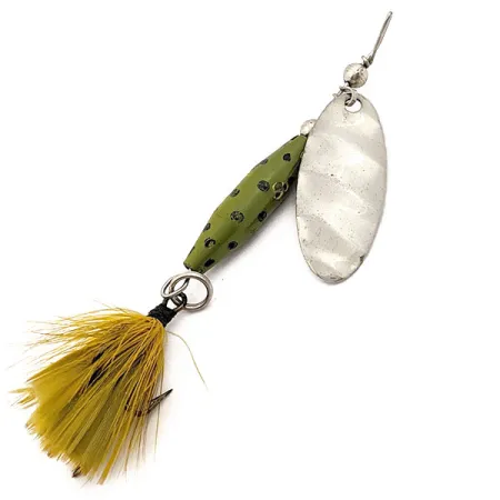 Une palette tournante classique avec une finition nickelée, marquée de l'estampille Glen L. Evans Caldwell, Idaho, définit ce pilier de la pêche au lancer du milieu du siècle. Pesant 1/4 oz (7 g), le Glen Evans Shyster présente un corps fuselé vert orné de points noirs appliqués à la main le long de sa structure de 7 cm (2 3/4"). L'armement est pourvu d'un hameçon triple à plumes jaunes, fixé par un anneau brisé robuste, un choix de conception privilégié pour cibler la truite et les perches dans diverses conditions d'eau. Identifié par le code produit 17901, cet exemplaire témoigne du savoir-faire du fabricant basé dans l'Idaho. L'état est évalué à 5/5, car la peinture verte reste éclatante et la palette nickelée présente une usure minimale, préservant la lisibilité du marquage. Ce modèle spécifique utilise un corps lesté pour accroître la distance de lancer sans nécessiter de plomb supplémentaire.