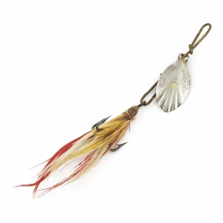 Estampillée d'une date de brevet canadien de 1874, la palette nickelée de ce spinner de taille 1 présente le design classique en forme de coquille cannelée. La face de la palette arbore la marque du fabricant G.M. Skinner de Clayton, New York, témoignant de la netteté de la frappe originale. Une longueur totale de 7 cm (2 3/4") s'associe à un poids de 3,5 g (1/8 oz) pour ce spécimen identifié par le code 24500. Des plumes rouges, jaunes et blanches sont solidement ligaturées à l'hameçon triple, créant un profil visuel vibrant. Affichant un état de 5/5, le placage en nickel conserve un fini brillant sur les surfaces cannelées.