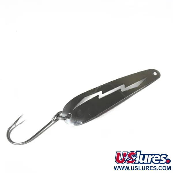 Mesurant 8 cm (3 1/4"), cette cuillère de traîne Great Lakes Lures fabriquée aux USA fait partie de la série spécialisée Great Lakes de la marque. Son poids de 5 g (3/16 oz) en fait un choix agile pour diverses vitesses de traîne. Une face présente un motif d'éclair net, tandis que le revers affiche une bande diagonale de paillettes rouges et un œil chartreuse vif. Ce spécimen porte le code produit 0479 et reste en excellent état avec une note de 4/5, arborant une finition nickel brillant sur tout le corps. Le leurre est terminé par un hameçon simple monté sur un anneau brisé robuste, un montage privilégié pour sa résistance et sa fiabilité lors de la touche.