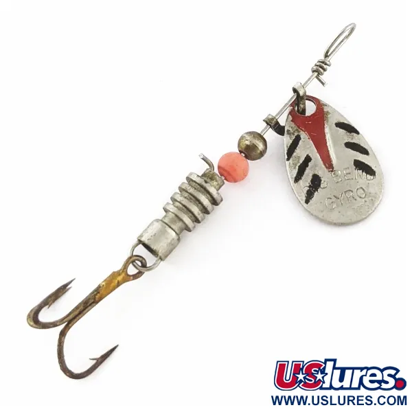 L'inscription « BIG BEND GYRO » est clairement frappée sur la palette argentée de type feuille de saule, signature emblématique de cette rareté vintage de fabrication japonaise. Mesurant 5,5 cm (2 1/4") de long et pesant seulement 2,5 g (3/32 oz), ce leurre illustre parfaitement la finesse de l'artisanat des exportations japonaises du milieu du siècle. La structure du corps se compose d'un empilement de métal nervuré, agrémenté d'une perle orange vif et d'une entretoise sphérique argentée permettant à l'ensemble de la palette de tourner librement sur l'axe. Des zébrures noires appliquées à la main et un chevron rouge vif décorent la palette, apportant un contraste visuel saisissant au métal poli. Ce spécimen, identifié par le code produit 24391, est équipé de son hameçon triple d'origine et se trouve dans un état exceptionnel de 5/5, présentant une peinture et des composants parfaitement préservés. L'armature se termine par un œillet ligaturé à la main, une caractéristique structurelle courante pour les cuillères ultra-légères de cette période.