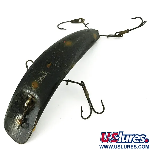 Mesurant exactement 9 cm (3 1/2"), le profil courbé en bois de ce Helin FlatFish illustre le savoir-faire classique de la production initiale basée à Detroit. Une couche de base noire décorée de points orange-jaune répartis offre un contraste élevé, un motif longtemps privilégié pour diverses conditions d'eau douce. Ce modèle de 10 g (1/3 oz), identifié par le code produit 7127, est équipé du système traditionnel de montage à barre d'écartement Helin, conçu pour maximiser les taux de ferrage tout en maintenant l'équilibre prévu du leurre lors d'une traîne lente. La finition de surface est notée 4/5, présentant des lignes fines et des signes d'histoire sur la surface en bois qui reflètent son parcours à travers les boîtes à pêche. Chaque œillet et crochet reste intact, soulignant la qualité de fabrication robuste pour laquelle Helin Tackle était réputée avant la transition vers les matériaux plastiques. Les pêcheurs les utilisaient à l'origine pour la truite et le brochet, comptant sur les performances à basse vitesse dictées par la conception unique de la tête à face plate.