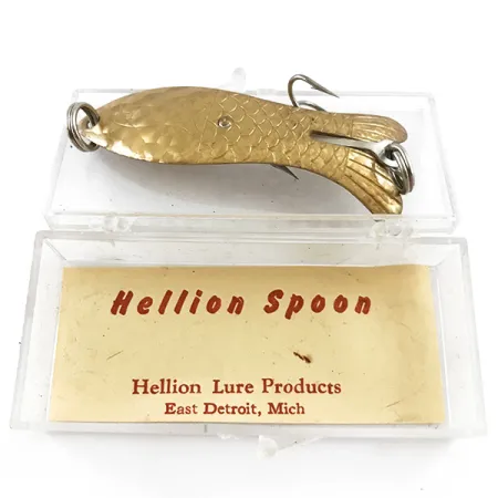 Estampée d'un motif d'écailles détaillé sur sa surface dorée, cette Hellion Fish Crystal provient de l'historique société Hellion Lure Products d'East Detroit, Michigan. Pesant 12g (2/5oz) pour une longueur de 7cm (2 3/4"), le leurre présente un corps unique en forme de poisson se terminant par une queue bifurquée. La finition Crystal fait référence à la texture martelée réfléchissant la lumière qui recouvre l'extérieur métallique. Ce spécimen est resté inutilisé, conservé dans son emballage plastique d'origine avec sa carte d'insertion d'usine intacte. Pour le ferrage, il utilise un hameçon simple arrière équipé d'un protège-pointe anti-herbe, fixé par un rivet robuste et un anneau brisé. Référencé sous le code 11605, le leurre conserve les arêtes vives et l'éclat d'une pièce de pêche du milieu du siècle dernier. Le revers révèle l'estampille du fabricant, attestant de son origine authentique du Michigan.