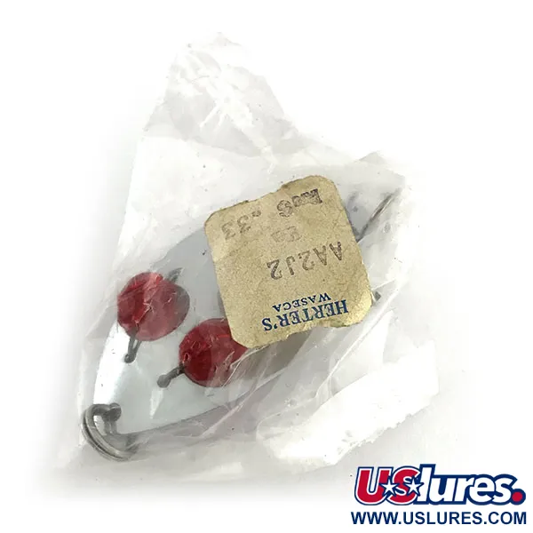 Des yeux en verre rouge sont sertis directement dans le corps nickelé de cette cuillère Herter's Glass eye spoon, une caractéristique de conception distincte de l'après-guerre. Ces leurres ont été fabriqués au Japon occupé pour l'emblématique marque de plein air américaine, liant la production mondiale à ses racines de Waseca, Minnesota. Pesant 11 g (2/5 oz) pour une longueur de 5,5 cm (2 1/4"), cette cuillère offre un profil substantiel pour le lancer ou la traîne en eau douce. Le verso comporte le nom et le lieu du fabricant estampillés dans le métal. Ce spécimen particulier est inutilisé, toujours logé dans son sachet en plastique transparent d'origine avec l'étiquette en papier vintage marquée AA2J2 et un prix d'origine de 33 cents. La finition nickel reste brillante et les deux inserts d'yeux en verre rouge sont solidement fixés. Portant le code produit 8987, le leurre comprend un anneau brisé en tête pour une connexion directe à un bas de ligne ou à un émerillon.