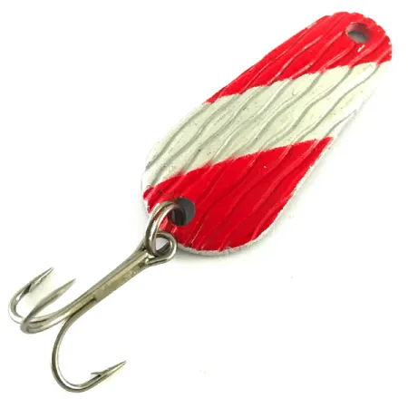 Doté d'un motif ondulé unique sur sa face, le corps métallique de 4 cm (1 1/2") arbore un motif audacieux de rayures diagonales rouges et blanches sur une base de nickel. Ce spécimen particulier, identifié par le code produit 6261, pèse 7 g (1/4 oz) et représente le profil classique des leurres de lancer du milieu du siècle. En retournant la cuillère, on découvre le marquage frappé « HERTER'S HUDSON BAY SPOON » ainsi que la mention d'origine « JAPAN », tous deux parfaitement lisibles sur le dos en nickel poli. L'armement est exceptionnellement bien entretenu, avec un anneau brisé solide et un hameçon triple piquant. Avec une note d'état de 5/5, la peinture de cette cuillère est éclatante et le métal présente un reflet brillant et propre. La surface texturée est un élément de conception fonctionnel destiné à capter et à renvoyer la lumière sous plusieurs angles lors d'une récupération linéaire.