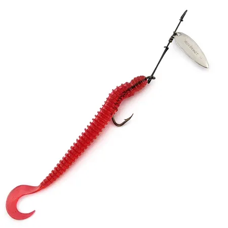 Une palette classique feuille de saule en finition nickelée, clairement estampillée du nom Hildebrandt, sert d'attracteur principal à ce montage 20404. Pesant 3/16oz (4,5g), l'ensemble combine une armature de spinner traditionnelle et un corps en plastique souple rouge translucide. Ce grub annelé de 6" (15cm) est monté sur un hameçon simple, offrant un profil volumineux idéal pour prospecter des environnements variés. Fabriqué aux États-Unis par Hildebrandt Spinners, l'armature témoigne d'un enroulement métallique précis et d'une finition de haute qualité sur la palette. L'exemplaire est dans un état 5/5, le placage nickel réfléchissant parfaitement la lumière et le plastique rouge conservant sa souplesse originelle. L'hameçon demeure piquant et parfaitement positionné dans les segments annelés du corps du leurre.