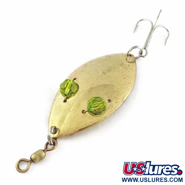 Des yeux en verre facetté vert constituent le point focal de cette cuillère vintage de 1 oz (25 g), captant la lumière pour déclencher l'attaque des carnassiers curieux. Mesurant 3" (7,5 cm), la Hofschneider Red Eye Wiggler à finition dorée a été conçue pour les récupérations lentes appréciées par les pêcheurs de brochets et de perches lors des fortes chaleurs estivales. Son corps large en métal arbore la forme de feuille classique typique de la production américaine du milieu du siècle, complété par un émerillon baril en laiton robuste et un hameçon triple standard. Référencé sous le code produit 24288, cet exemplaire conserve un éclat brillant sur sa surface dorée, créant un contraste marqué avec les yeux vert vif. Chaque élément, des perles de verre aux anneaux brisés, est en excellent état, ce qui lui vaut une note de condition de 5/5.
