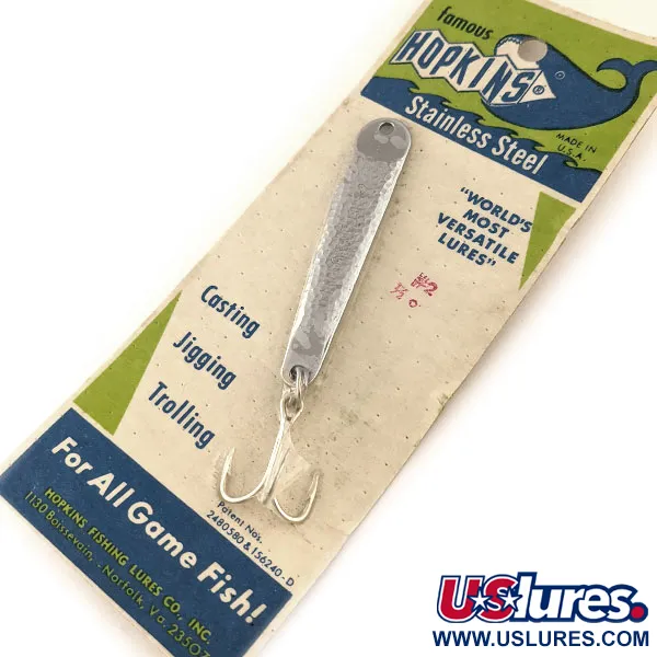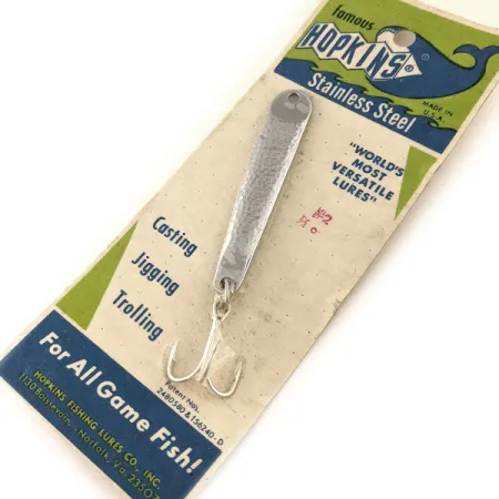 Une finition distinctive en nickel martelé définit ce leurre Hopkins No=Eql vintage, captant la lumière grâce à sa surface texturée en acier inoxydable. Avec une longueur de 6,5 cm (2 1/2") et un poids de 14 g (1/2 oz), le modèle 11401 est conçu en acier inoxydable massif pour éviter tout écaillage ou décollement au fil du temps. Ce spécimen particulier reste inutilisé et est toujours fixé à sa carte de présentation d'origine 'famous HOPKINS', classée en condition 6. Produit par la Hopkins Fishing Lures Co., Inc. à Norfolk, Virginie, le leurre est équipé d'un hameçon triple étamé et porte les numéros de brevet 2480380 et 156240-D. L'emballage détaille sa polyvalence pour le lancer, le jigging et la traîne pour tous les poissons de sport en eau douce et salée. Le verso de la carte fournit des conseils techniques pour une utilisation efficace, recommandant des vitesses de récupération variées et des profondeurs spécifiques pour le jigging près de structures comme les ponts ou les jetées.