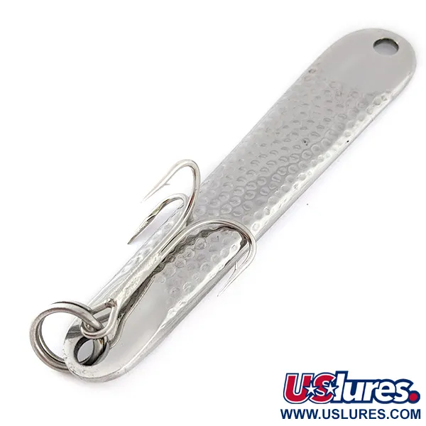 Un placage en nickel martelé définit la surface de ce leurre métallique de 60 g (2 oz), un concept né en 1949 de la quête de R.L. Hopkins pour un outil de lancer robuste en mer. Mesurant 10,5 cm (4 1/4"), le Hopkins No=Eql 3 est conçu avec un profil dense destiné à atteindre rapidement les profondeurs. Le corps arbore l'estampille claire 'HOPKINS NO-EQL @ 3 1/2' sur sa face texturée, ce qui aide à fragmenter les reflets lumineux. L'hameçon triple et l'anneau brisé renforcé sont dans un état 5/5, affichant une apparence brillante et nette. Référencé sous le code produit 22591, ce leurre utilise une attache à œillet simple sur son nez effilé. Sa fabrication est principalement axée sur le lancer et le jigging, où le poids et la résistance à la corrosion sont prioritaires.