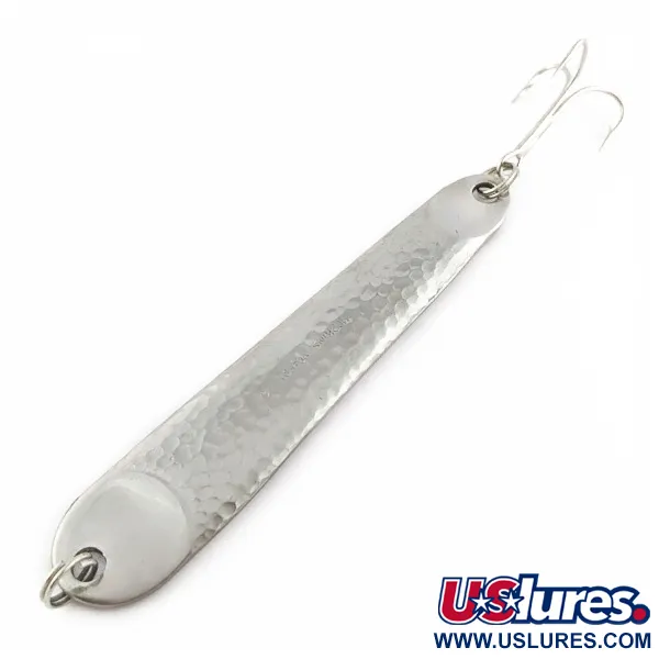 Sa finition en nickel martelé confère un profil visuel unique à ce pilker de 70 g (2 1/2 oz), un design issu de la quête de R.L. Hopkins en 1949 pour un leurre de mer plus robuste. Mesurant 11,5 cm (4 1/2"), le Hopkins No=Eql 4 (code produit 24291) est forgé pour offrir la densité nécessaire afin d'atteindre les structures profondes ou de fendre les vents forts lors du lancer. L'exemplaire présenté ici est dans un état 5/5, conservant son éclat brillant et son intégrité structurelle. Un hameçon triple renforcé est fixé à l'arrière, témoignant de l'engagement du fabricant pour un armement capable de résister à la puissance d'un poisson trophée. Principalement utilisé pour le jigging vertical ou les lancers à longue distance pour des espèces telles que le sandre ou le bar rayé, sa conception reste une référence pour les pêcheurs en quête de solidité et de poids.