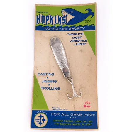 Des écailles en nickel martelé captent la lumière sur les 6,5 cm (2 1/2") de ce jig métallique classique. Pesant 21 g (3/4 oz), le Hopkins Shorty 75, identifié par le code produit 10069, reste un incontournable pour ceux qui apprécient le savoir-faire américain des États-Unis. Ce spécimen particulier est inutilisé, présenté dans son emballage vintage d'origine avec une note d'état de 6. La surface alvéolée distinctive du corps est conçue pour imiter l'éclat des poissons fourrage, associée à un hameçon triple robuste fixé via un anneau brisé. Selon la carte d'origine, il a été conçu comme un choix polyvalent pour le lancer, le jigging ou la traîne en eau douce comme en mer. La carte répertorie le modèle sous le numéro 75 et souligne l'utilisation de l'acier inoxydable, gage de la durabilité qui a fait la renommée de Hopkins à Norfolk, en Virginie.