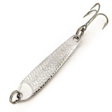 Une finition en nickel martelé définit le profil visuel de cette cuillère à jigger classique, présentant une texture alvéolée conçue pour capter et refléter la lumière sous plusieurs angles. Avec une longueur compacte de 4,5 cm (1 3/4") et un poids de 9 g (1/3 oz), ce Hopkins Shorty S1 constitue un choix polyvalent pour les présentations verticales ou le lancer. Le corps est clairement estampillé du nom du fabricant et du modèle, et il est répertorié sous le code produit 12423. Fabriqué aux États-Unis, le métal massif est associé à un hameçon triple piquant et à des anneaux brisés renforcés aux deux extrémités. L'exemplaire est en état 5/5, conservant une surface brillante et propre qui souligne l'éclat original du placage en nickel sur le corps forgé. La conception dense de ce modèle est spécifiquement étudiée pour atteindre rapidement la profondeur souhaitée lors de la traque des espèces dans les couches d'eau profondes.