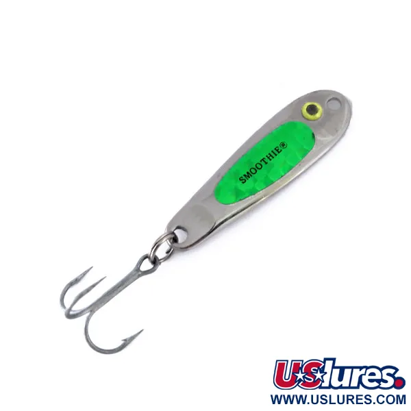 La luminescence définit l'attrait de l'insert vert présent sur cette cuiller ondulante à la finition nickelée, qui brille intensément dans des conditions de faible luminosité ou sous UV. Forgée aux États-Unis, la Hopkins Smoothie (Code Produit 10048) présente un panneau texturé « Glow » qui passe d'un vert vif à la lumière du jour à un néon spectral dans les profondeurs. Mesurant 6 cm et pesant 21 g, son corps dense est conçu pour les lancers longue distance et le jigging vertical. Un petit œil cerclé de jaune est positionné près de l'attache, offrant un point de contraste contre le métal poli. Ce spécimen est conservé dans un état 5/5, conservant sa finition d'origine et ses triples acérés. Le marquage « SMOOTHIE® » est clairement frappé dans l'insert fluorescent.