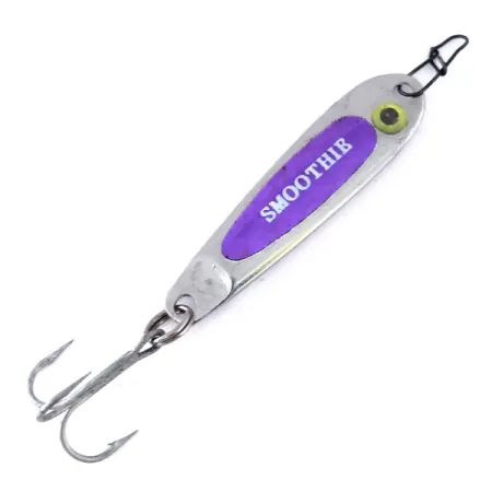 Un placage en nickel recouvre le corps de 5,5 cm (2 1/4 pouces) de cette cuillère à jigger fabriquée aux USA. Pesant 11 g (2/5 oz), ce leurre porte le code produit 10114 et arbore la signature 'SMOOTHIE' sur une étiquette bleu-violet éclatante. Un œil jaune constitue un point focal distinct sur la tête, contrastant avec la finition métallique polie. Cet exemplaire Hopkins est dans un état 5/5, affichant ses surfaces d'origine et un armement propre. La queue est équipée d'un hameçon triple robuste, tandis que le nez est muni d'une agrafe montée en usine pour un montage rapide au bord de l'eau.