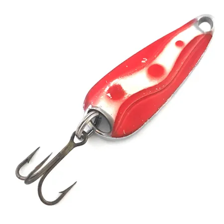 Le nickelage sur la face arrière offre une base à haute brillance pour ce classique Luhr Jensen de 4 cm (1 1/2"). La face avant présente un motif ondulé rouge et blanc audacieux accentué par des points rouges distincts, une finition conçue pour une visibilité accrue dans diverses conditions d'eau. Pesant 7 g (1/4 oz), ce Hot Shot W, identifié par le code produit 5263, témoigne de l'héritage de la fabrication de matériel de pêche aux États-Unis. Un marquage net 'HOT SHOT W PAT. PEND.' est gravé directement dans le métal poli au dos. Le leurre est équipé d'un anneau brisé robuste et d'un hameçon triple à finition sombre. Ce spécimen est en condition 4/5, présentant une surface peinte bien entretenue et un fini nickel brillant et réfléchissant.