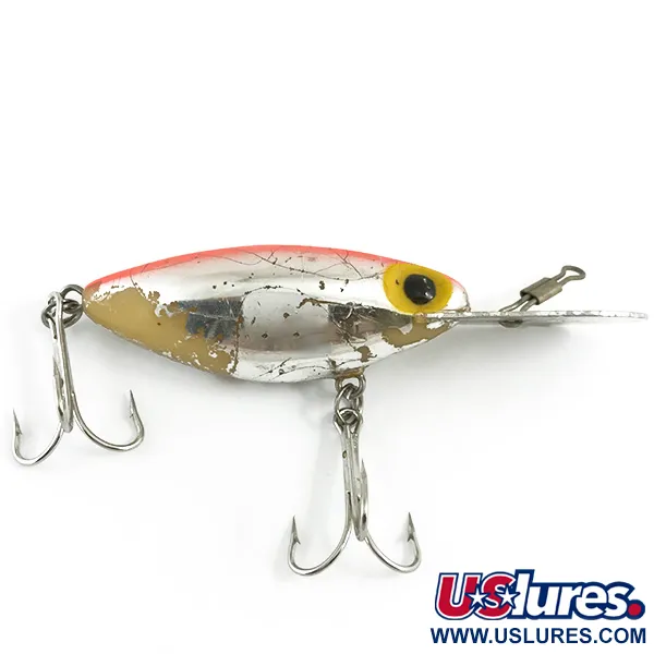 Mesurant exactement 7 cm (2 3/4"), ce spécimen illustre une époque classique de la fabrication de leurres américains issue du catalogue Storm pré-Rapala. La finition chrome argenté du corps présente un caractère authentique où le placage s'est affiné avec le temps pour révéler le substrat beige, justifiant une note d'état de 4/5. Un dos rouge fluorescent vibrant offre une grande visibilité contrastant avec les flancs argentés, complété par de grands yeux peints en jaune aux pupilles noires. Équipé d'une bavette métallique surdimensionnée emblématique et d'un émerillon à agrafe intégré, ce leurre de 12g (2/5oz) est conçu pour atteindre des profondeurs de 1,5m à 4m (5ft - 13ft). Référencé sous le code produit 4454, ce modèle est un incontournable pour les pêcheurs ciblant le brochet, le sandre et la perche en traîne ou en lancer-ramener. L'armement reste fonctionnel, comprenant deux hameçons triples (ventre et queue) fixés par des anneaux brisés d'origine.