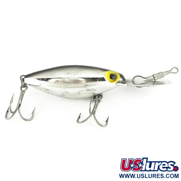Le placage chrome Mirror Silver confère à ce spécimen un aspect hautement réfléchissant, véritable signature des débuts de la production Storm aux USA. Pesant 21 g (3/4 oz) pour une longueur de 8 cm (3 1/4"), ce leurre possède une bavette métallique surdimensionnée estampillée THIN FIN, STORM et U.S. PAT. Cette quincaillerie spécifique identifie sa lignée historique avant le rachat de la marque par Rapala. Le corps est équipé de deux hameçons triples et affiche un état de 5/5, conservant son éclat d'origine. Des yeux jaunes distinctifs avec des pupilles noires apportent un détail contrasté sur la finition métallique polie. Ce modèle, identifié par le code produit 7217, est conçu pour atteindre des profondeurs de 1,5 à 4 m (5-13 ft) lors de manœuvres de traîne, de lancer ou de dérive.