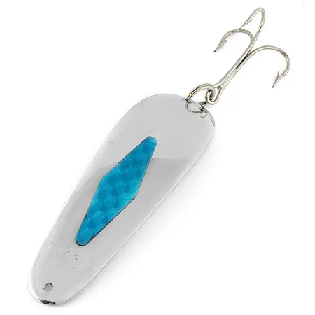 Mesurant 9 cm de long, cette cuillère fabriquée aux États-Unis présente le profil distinctif qui a fait la renommée de Miller. Le corps en finition nickel de cette cuillère de traîne ITHACA 75 arbore un insert bleu vif au motif de losanges, créant un contraste marqué avec le métal poli. Affichant un poids de 10 g, ce leurre est doté d'une queue large et arrondie et d'un nez plus étroit, une conception parfaitement adaptée aux montages de traîne traditionnels. Au verso, la surface réfléchissante et propre est bien conservée, laissant apparaître la courbure fluide du métal embouti. L'armement se compose d'un hameçon triple robuste aux tons argentés, relié par un anneau brisé solide, les deux semblant en excellent état. Pour cette pièce portant le code produit 22642, l'état est un remarquable 5/5, conservant son éclat d'origine sans défaut majeur. Ce modèle Ithaca 75 spécifique constitue une trouvaille de choix pour les collectionneurs s'intéressant aux fabricants de leurres régionaux américains de la région d'Ithaca, à New York.