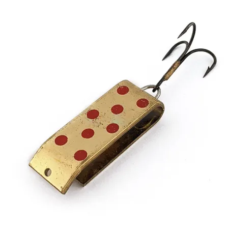 Des points rouges agrémentent la finition dorée classique de ce leurre métallique vintage de 3,5 cm (1 1/2"). Répertorié sous le code produit 18180, ce modèle présente une conception unique en plaque pliée combinant les propriétés d'une cuillère oscillante et d'une cuillère tournante. Pesant 9 g (1/3 oz), le Lil Jake est équilibré pour des lancers précis en ruisseau ou en lac. Ce leurre fabriqué aux États-Unis, dans le Wyoming, présente des signes de manipulation soigneuse, ce qui lui vaut une note d'état de 4/5. Le placage doré conserve un éclat brillant sur l'ensemble du corps rectangulaire, qui se termine par une courbure marquée près de l'attache. Un hameçon triple bronzé est solidement fixé par un anneau brisé robuste à l'arrière, reflétant l'aspect utilitaire et robuste propre aux premières productions de Jake's Lures.
