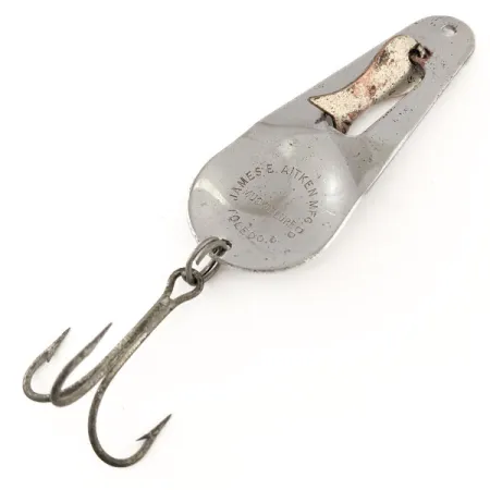 Frappé de manière lisible sur la face convexe, le marquage du fabricant James Aitken de Toledo, Ohio, confirme l'origine de cette cuillère nickelée de 8 cm. Ce modèle Muskielure spécifique, code produit 11652, est un lien direct avec les créations de 1932-1933 de Percy Haver, un nom synonyme de captures légendaires de maskinongés dans le lac Sainte-Claire. Le design est distinctif grâce à une petite silhouette métallique en forme de poisson fixée dans la découpe du corps principal, offrant un profil visuel unique pour le lancer ou la traîne. Pesant 21 g, le leurre est armé d'un hameçon triple robuste, conçu pour résister à la pression des grands carnassiers d'eau douce. La finition nickel reste brillante sur la majeure partie de la surface, ce qui lui vaut une note de condition de 4/5 pour son usure authentique et son métal bien conservé. Son armature est d'origine, incluant le grand anneau d'attache à la proue et l'anneau brisé renforcé reliant l'hameçon à la queue.