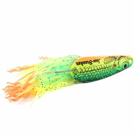 Pesant 1/2 oz (15,5 g), le corps en métal dense de ce grand classique de Northland offre une distance de lancer significative pour atteindre la végétation dense. Cette cuillère anti-herbe fabriquée aux USA présente un motif d'écailles vif Fluorescent Green / Yellow sur la face supérieure, accentué par un estampillage 'Jaw-Breaker' audacieux. Le revers du leurre révèle une finition métallique dorée et un montage d'hameçon à tête plombée directement intégré au cadre. La jupe fixée ajoute du volume visuel avec un mélange de brins verts, jaunes et pointes orange parsemés de fines paillettes noires. Mesurant 5,5 cm (2 1/4"), sa conception est optimisée pour passer à travers les nénuphars épais et les bois morts. Ce spécimen, identifié par le code produit 1379, affiche un état de conservation de 4/5 avec des graphismes nets et une jupe souple.