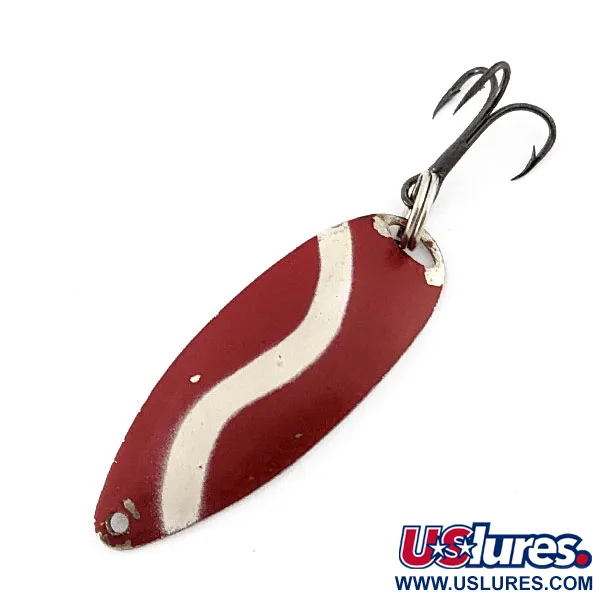 Des rayures ondulées rouges et blanches ornent la face peinte éclatante de cette cuillère de 3/16 oz (4,5 g). Le revers du leurre révèle un dos argenté poli, profondément gravé au nom « JOHNSON'S SPRITE », un élément distinctif qui reflète l'histoire de la marque Johnson dans la fabrication de leurres métalliques durables. Ce modèle spécifique, identifié par le code produit 22334, est conservé dans un état 4/5, affichant une finition propre et son armature d'origine. La cuillère dispose d'un unique œillet d'attache au nez effilé et d'un anneau brisé robuste reliant un hameçon triple à finition sombre à l'extrémité arrière. Son profil lesté en goutte d'eau et sa construction métallique massive ont été spécifiquement conçus pour les techniques de lancer et de traîne.