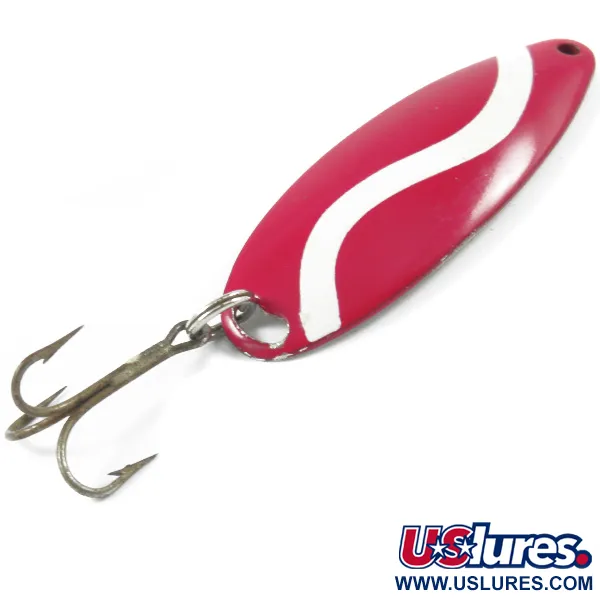 Clairement estampillée sur le revers en nickel poli, l'identification de la marque marque ce Johnson Sprite comme une pièce authentique de l'histoire du matériel de pêche américain. Mesurant 5 cm (2") et pesant 10 g (1/3 oz), cette cuillère ondulante présente une finition rouge à fort contraste sur la face, accentuée par un motif de vague en "S" blanc audacieux. Portant le code produit 3262, ce spécimen provient de l'époque de production originale aux USA, un point de distinction pour les collectionneurs depuis que la fabrication de la marque a été délocalisée en Chine. L'état est noté 5/5, la peinture et le placage en nickel réfléchissant restant exceptionnellement propres. Un triple robuste est fixé à la base via un anneau brisé, ce qui la rend prête pour le lancer ou la traîne.