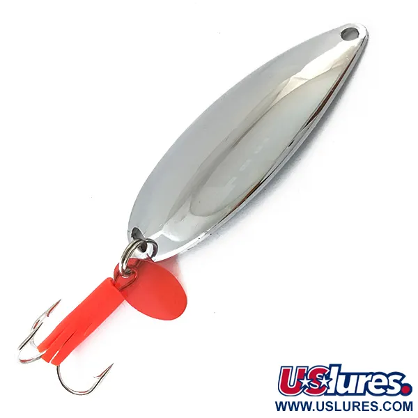 Clairement gravé dans le placage en nickel poli, le marquage « JOHNSON'S SPRITE » identifie cette cuillère ondulante particulière comme une véritable pièce de l'histoire du matériel de pêche américain. Mesurant 7 cm (2 3/4") et pesant 14 g (1/2 oz), ce modèle témoigne d'une époque où la production de Johnson était encore basée aux États-Unis. La finition nickel miroir est associée à un flipper caractéristique en plastique rouge à la queue, un détail conçu pour offrir un contraste visuel avec l'éclat du corps métallique. L'armement comprend un hameçon triple robuste habillé d'une gaine orange vif, qui reste en excellent état. Répertorié sous le code produit 4648, le leurre conserve un état de 5/5, présentant une surface remarquablement propre et réfléchissante. La fabrication de ce spécimen témoigne des techniques de placage durables utilisées par le fabricant avant que la production ne soit délocalisée à l'étranger.