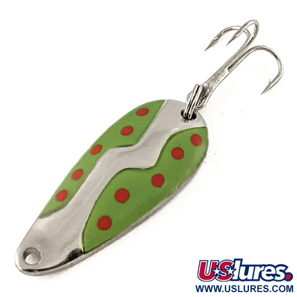 Un placage en nickel sert de base brillante à la finition Vert / Nickel contrastée de cette cuillère de 4,5 cm (1 3/4"). Le nom Kamlooper et la marque Acme sont clairement estampillés au dos, identifiant ce modèle comme un véritable outil de fabrication américaine en provenance des USA. Pesant 11 g (2/5 oz), le leurre présente un motif ondulé distinctif sur sa face où la peinture verte est rehaussée de petits points rouges éclatants. Cet exemplaire spécifique, identifié par le code produit 12168, est dans un excellent état 5/5, conservant une surface polie et un hameçon triple piquant attaché via un anneau brisé robuste. Le profil en forme de goutte d'eau est un incontournable pour les pêcheurs de truites et de saumons, utilisant la surface réfléchissante en nickel pour compléter les détails peints lors d'une récupération linéaire ou à la traîne.