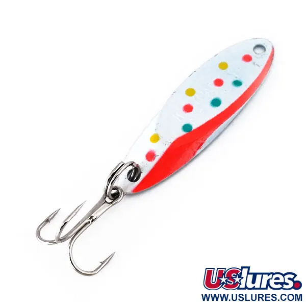 Des points multicolores jaunes, bleus et rouges ressortent sur la surface peinte en blanc de cette cuillère ondulante de 1/4oz (7g), emblématique de la gamme Acme en provenance des USA. Mesurant 1 3/4" (4,5 cm), la face avant est ornée d'une bande rouge audacieuse, tandis que le revers présente une finition en nickel poli. Ce spécimen particulier, portant le code produit 10354, est fabriqué à partir d'un alliage spécialisé qui assure un équilibre précis lors des lancers ou du jigging en eaux profondes. L'armement se compose d'un anneau brisé robuste associé à un hameçon triple piquant, adapté à une utilisation en eaux calmes comme dans les courants forts. En termes de conservation, le leurre est dans un état 5/5, conservant un aspect propre et vibrant dans son coloris Trout / Nickel. Les pêcheurs utilisent généralement ce poids et ce profil pour cibler une grande variété d'espèces prédatrices au fil des saisons.