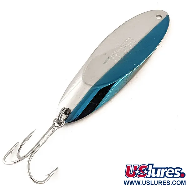 Avec un poids de 56 g (2 oz), cette cuiller ondulante massive offre la densité nécessaire pour atteindre les fosses profondes ou lancer face à des vents violents. Mesurant 8,5 cm (3 1/4"), le leurre présente une esthétique bicolore frappante avec un éclat bleu vif côtoyant sa surface en argent poli. Cette véritable Acme Kastmaster, code produit 12137, est fabriquée aux États-Unis et porte clairement l'estampille du fabricant sur sa face. Sa conception spécifique en biseau repose sur un alliage spécialisé pour maintenir l'équilibre lors de la descente et de la récupération. L'armement se compose d'un anneau brisé renforcé et d'un large hameçon triple conçu pour cibler les gros prédateurs. Actuellement noté 5/5, le fini réfléchissant est exceptionnellement propre. Sa polyvalence la rend adaptée au jigging ou à la traîne à travers différentes colonnes d'eau.