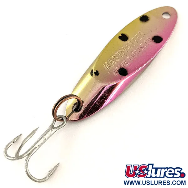 Un placage en nickel constitue la base de cette cuillère de 4,5 cm (1 3/4"), dont la face supérieure arbore un dégradé Truite Arc-en-ciel saisissant. L'estampille « KASTMASTER ACME TACKLE CO. » atteste de son origine américaine et reflète la qualité d'usinage de l'alliage de laiton d'origine. Avec un poids de 7 g (1/4oz), ce modèle portant le code produit 12312 est conçu pour la polyvalence, souvent utilisé pour le jigging en eaux profondes ou la récupération classique dans le courant. Côté finition, la peinture passe en douceur d'un jaune doré au nez à une riche teinte rose à la queue, parsemée de cinq points noirs imitant un alevin. L'état est noté 5/5, présentant un dessous en nickel poli miroir impeccable et un hameçon triple d'origine bien affûté. L'équilibre spécifique entre l'épaisseur du métal et la coupe biseautée définit le standard Acme de la série, garantissant l'action de nage prévue lors de la descente. Un anneau brisé robuste maintient l'armement argenté, tandis que l'oeillet d'attache reste propre et sans débris.