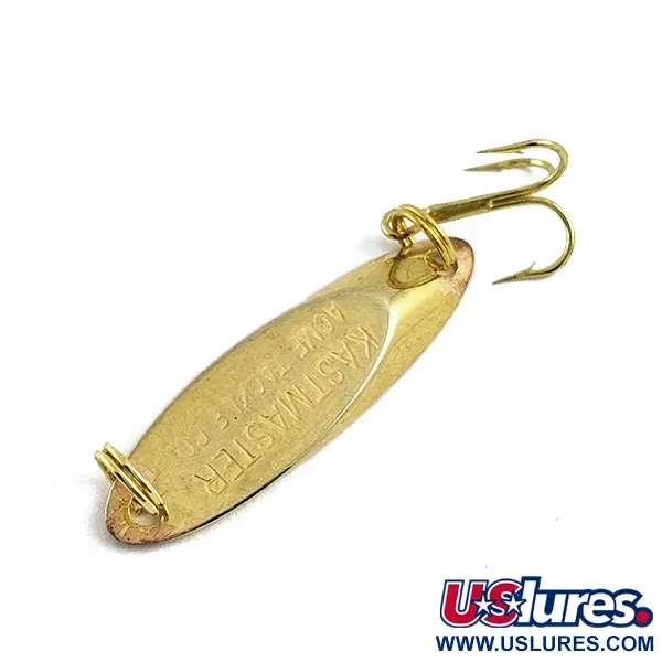 Gravée directement dans le métal, la marque 'KASTMASTER ACME TACKLE CO.' identifie cette cuillère authentique fabriquée aux États-Unis comme un grand classique de la boîte à pêche. Ce modèle, portant le code produit 16991, présente une finition dorée brillante qui réfléchit efficacement la lumière, que ce soit au lancer ou en jigging vertical. Pesant 1/8 oz (3,5 g) pour une longueur de 1 1/2" (3,5 cm), ce leurre est usiné dans un alliage spécifique qui garantit un équilibre et une densité parfaitement adaptés à sa taille. L'hameçon triple d'origine à finition dorée et les anneaux brisés sont en excellent état, ce qui lui vaut une note de condition de 5/5. Fabriquée aux USA, sa conception à flancs plats témoigne des standards de fabrication maintenus par Acme depuis des décennies, en faisant un choix fiable pour traquer diverses espèces tant en eau calme qu'en courant.