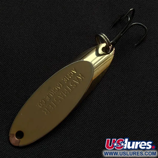Une finition dorée brillante capte la lumière sur le profil angulaire distinctif de cet Acme Kastmaster. Pesant 1/4 oz (7 g), ce leurre est usiné dans un alliage de laiton spécifique qui lui confère la densité nécessaire pour les lancers à longue distance et le jigging vertical. La face est clairement estampillée « KASTMASTER ACME TACKLE CO. », un gage d'authenticité qui le distingue des cuillères classiques. Répertorié sous le code produit 21766, ce spécimen ne présente que de légères marques de surface dues à une manipulation mineure, ce qui lui vaut une note de 4/5. Son armement comprend un anneau brisé robuste et un hameçon triple piquant doté d'un revêtement sombre. Cette conception est très appréciée pour sa polyvalence, restant efficace dans les courants forts où les cuillères plus légères peinent souvent à atteindre la profondeur voulue.
