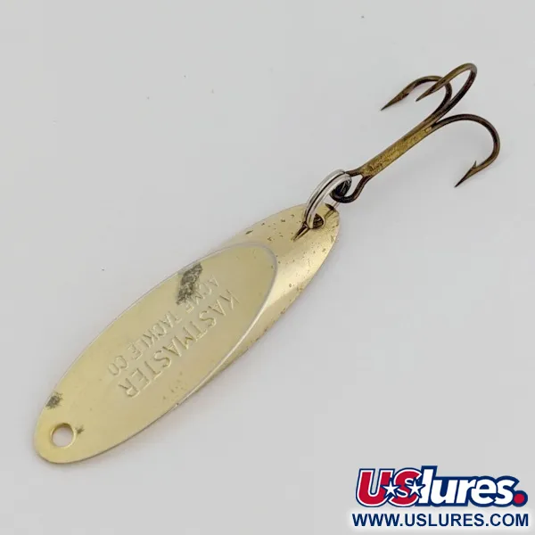 La finition dorée confère à cette cuillère de type « slab-cut » un éclat réfléchissant qui reste visible même en eaux troubles. L'alliage métallique spécial utilisé par Acme pour cette cuillère de 1/4 oz (7 g) offre la densité spécifique nécessaire à une vitesse de coulée équilibrée. Mesurant 1 3/4" (4,5 cm), son profil effilé distinctif favorise la précision des lancers à longue distance. Ce spécimen est en condition 4/5, présentant de légères taches d'oxydation sur la surface plaquée tout en conservant sa forme originale. Les marquages d'identification pour le code produit 24505 incluent le nom de la marque et du fabricant clairement estampillés sur la face avant. La cuillère se comporte de manière fiable, qu'elle soit utilisée comme un jig lourd en eau profonde ou ramenée dans le courant.