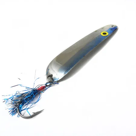 Les finitions nickel et bleu définissent le profil élancé de cette cuillère de traîne fabriquée aux États-Unis, pesant 1/8oz (3,7g). Mesurant 3 1/4" (8cm) de long, la Kausch 14 est construite sur un corps métallique fin conçu pour les présentations de traîne en eaux profondes. La surface supérieure présente une bande bleue vibrante à côté du nickel réfléchissant, accentuée par un œil peint en jaune et noir près du point d'attache. Pour un attrait visuel accru, l'hameçon simple est habillé de fibres de tinsel bleues et argentées fixées par une petite ligature rouge. En retournant le leurre, vous trouverez le code produit 0441 marqué sur le dessous propre et non peint. Avec une note d'état de 4/5, la surface métallique conserve son éclat d'origine avec seulement des signes mineurs de manipulation. Des anneaux brisés robustes sont utilisés aux deux extrémités pour garantir que l'hameçon habillé et l'attache de ligne restent sécurisés toute la journée.