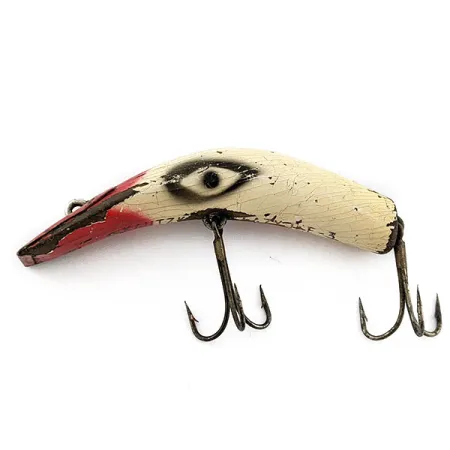 Un corps incurvé caractéristique définit la silhouette de ce modèle en bois de 7 cm (2 3/4"), véritable vestige de l'artisanat américain du milieu du siècle. Pesant 9 g (1/3 oz), le Kautzky Lazy Ike 3 porte le code produit 20123 et arbore un corps de couleur crème, rehaussé d'une face rouge vif et de larges yeux peints en forme de cible. La surface présente un réseau de fines craquelures sur le vernis et une usure importante de la peinture témoignant d'une utilisation régulière, ce qui lui vaut une note d'état de 3/5. Centré sur le flanc, le marquage d'origine identifie clairement sa provenance et son numéro de modèle. Deux hameçons triples montés sous le ventre présentent une forte oxydation et des traces de vieillissement, reflétant la longue histoire de ce leurre fabriqué dans l'Iowa.