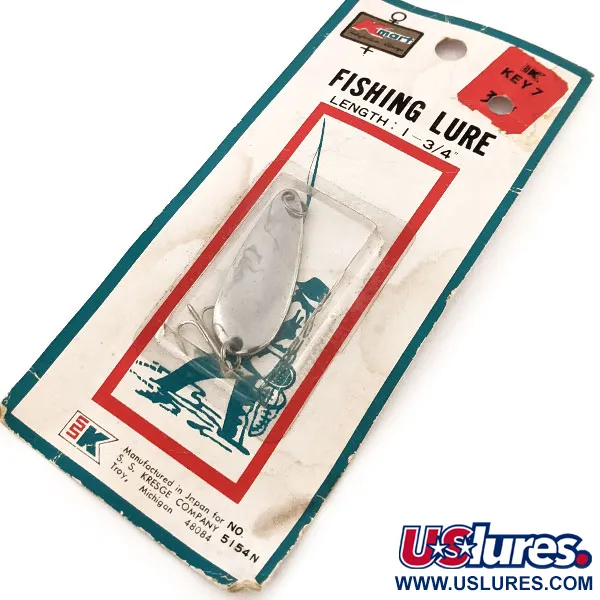 Un plaquage en nickel recouvre le profil en forme de larme de cette cuiller ondulante vintage, offrant une surface brillante parfaitement conservée dans son emballage d'origine. Pesant 4 g (1/8 oz) pour une longueur de 4 cm (1 1/2"), la Kmart Kresge #5154N incarne l'ère classique de la fabrication japonaise pour la S.S. Kresge Company de Troy, Michigan. Cet exemplaire est neuf, conservant son fini d'origine et son hameçon triple affûté. Identifié par le code produit 12909, le leurre est équipé d'un anneau brisé robuste pour le lancer ou le jigging. Le carton support porte le logo nostalgique de Kmart et mentionne explicitement le Japon comme pays d'origine, un gage de qualité pour le matériel de pêche du milieu du siècle. Bien que l'impression sur la carte suggère un cadre de 1 3/4", le corps métallique de 4 cm est caractéristique de ces leurres légers.