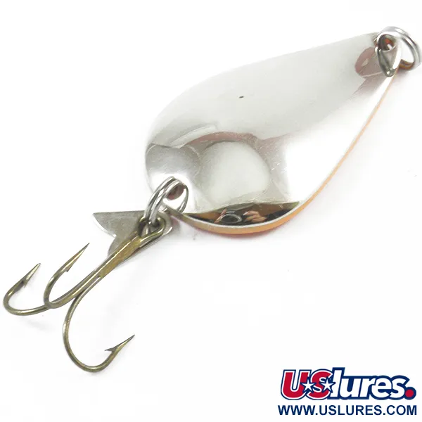Un placage de chrome et de nickel recouvre la surface convexe de cette cuillère ondulante en forme de goutte d'eau, associée à une finition orange vif sur la face interne. Pesant 21 g (3/4 oz) pour une longueur de 5,5 cm (2 1/4"), cette Acme K.O. Wobbler est équipée du système caractéristique « Sonic flipper tail » : une petite aileron métallique fixé à l'anneau brisé arrière à côté de l'hameçon triple. Répertorié sous le code produit 3226, ce modèle fabriqué aux États-Unis est dans un état 5/5, affichant une finition impeccable et des hameçons bronzés bien conservés. Sa conception utilise un métal de forte épaisseur, caractéristique de l'approche d'Acme pour créer des leurres denses favorisant des lancers efficaces. Le contraste de couleurs entre l'intérieur orange haute visibilité et l'extérieur en nickel réfléchissant reste net et bien défini sur l'ensemble du corps.