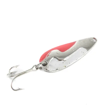 Pesant 7g (1/4oz), le corps métallique de cette cuillère Weber du milieu du siècle présente le profil distinctif 'Kobbler' embossé directement dans la surface. L'extérieur nickelé de 4,5cm (1 3/4") est accentué par un motif rouge et blanc audacieux, une combinaison de couleurs classique répertoriée comme Nickel / Rouge / Blanc. Sur le côté convexe, le nom du modèle est clairement frappé près de l'attache, témoignant de sa fabrication aux USA. Ce spécimen, identifié par le code produit 1529, est monté avec son hameçon triple d'origine fixé par un anneau brisé robuste. Avec une note d'état de 4/5, le leurre présente de légers signes d'âge tout en conservant un fini brillant et réfléchissant. Il reste un bel exemple de matériel de taille moyenne destiné au lancer-ramener continu ou à la traîne légère.