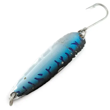 Un motif d'écailles de maquereau bleu profond orne la face supérieure de cette Luhr Jensen Krocodile #5, évoluant vers un fini nacré plus clair sur les bords. Mesurant 8,5 cm (3 1/4") pour un poids substantiel de 28 g (1 oz), cette cuillère est spécifiquement conçue pour atteindre de grandes distances de lancer. Le revers du leurre révèle les marquages authentiques « KROCODILE » et « LUHR JENSEN » estampés dans le dos en chrome poli. Le code produit 20377 est équipé d'un hameçon simple renforcé, ce qui en fait un choix fiable pour cibler les saumons en remontée ou les prédateurs marins où un ferrage puissant est impératif. Cet exemplaire affiche un état de 4/5, montrant une légère utilisation tout en conservant l'éclat de son motif maquereau et la haute réflectivité de son placage métallique. Son corps étroit et épais lui permet de fendre efficacement les vents de travers lors de lancers depuis une jetée ou un quai.
