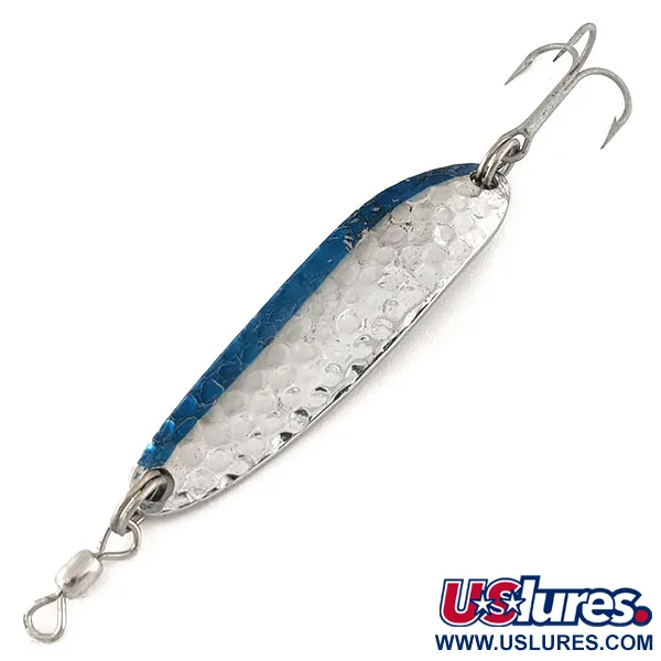 La marque « Krocodile DIE #3 » est clairement estampillée au dos, identifiant l'héritage de Luhr Jensen de Hood River, Oregon. Pesant 10 g (1/3 oz), cette cuillère présente une finition nickel martelé distincte qui capte la lumière sur sa surface texturée. Une bande bleue vive longe un bord du corps de 5,5 cm (2 1/4"), offrant un contraste saisissant avec le métal brillant. Ce spécimen spécifique, portant le code produit 12253, est en excellent état, classé 5/5. L'armement est robuste, comprenant un émerillon baril fixé par un anneau brisé en tête et un hameçon triple affûté en queue. Son profil étroit et légèrement incurvé est une signature du design Krocodile, principalement utilisé pour les techniques de lancer et de traîne. Le savoir-faire de ce modèle Die #3 reflète l'époque où ces leurres sont devenus indispensables pour les espèces d'eau douce et d'eau de mer. L'éclat chromé reste brillant sur les indentations martelées, soulignant la surface texturée.