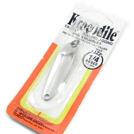 Le placage au nickel assure l'éclat principal de cette cuillère de 1/3 oz (10 g), une taille conçue pour la polyvalence sur plusieurs espèces. Mesurant 5,5 cm (2 1/4"), la Luhr Jensen Krocodile Die #3 présente un profil étroit et dense destiné aux lancers longue distance et à une descente rapide en profondeur. Ce spécimen, identifié par le code produit 1887, est présenté dans son emballage cartonné orange et blanc d'origine de l'époque de Hood River, Oregon. Le leurre reste inutilisé, conservé dans son blister d'origine, et est classé en condition 6. Un anneau brisé robuste est installé à l'attache, reflétant l'armature renforcée typique de la série Krocodile.