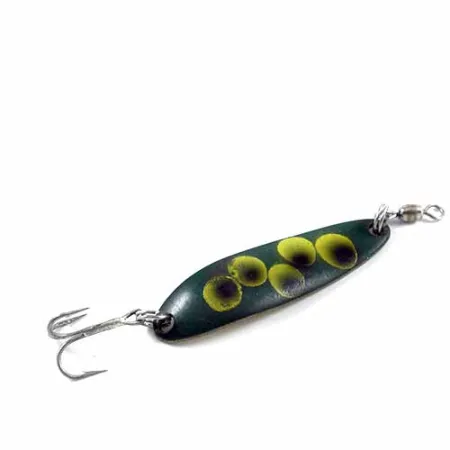 Une peinture vert foncé agrémentée de cercles jaunes vifs définit la face avant de ce modèle, arborant le motif classique « Frog » emblématique de l'héritage de Luhr Jensen. L'identifiant « Krocodile Die #3 » ainsi que l'origine du fabricant (Hood River, Oregon) sont clairement frappés sur le dessous en laiton poli. Pesant 1/3 oz (10 g) pour une longueur de 2 1/4" (5,5 cm), cette cuillère ondulante est conçue pour les lancers à longue distance et un contrôle efficace de la profondeur. L'armement du code produit 2716 est complété par un hameçon triple piquant et un émerillon baril pré-installé en tête pour limiter le vrillage de la ligne. Son état est classé 5/5, la face peinte et le dos en laiton métallique restant propres et distincts. Le corps épais est spécifiquement conçu pour être efficace lors de récupérations rapides ou lentes, en faisant un outil polyvalent pour cibler les saumons et autres carnassiers en eau profonde.