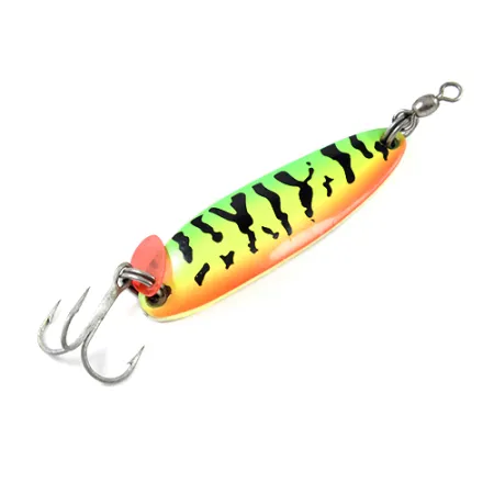 Estampillé profondément sur le dos en laiton, le nom « KROCODILE » et le marquage « DIE #3 » confirment que cette cuillère Luhr Jensen est un authentique classique de fabrication américaine. Pesant 1/2 oz (14 g) pour une longueur de 2 1/4" (5,5 cm), ce spécimen est lesté pour atteindre les zones de tenue plus profondes où se cachent les prédateurs. La face avant arbore le coloris classique Fire Tiger, avec des rayures verticales noires audacieuses passant du vert néon au jaune, pour finir sur un orange vif à l'extrémité. Notée 5/5, la finition est exceptionnellement propre, préservant l'éclat original du laiton poli sur l'envers. Elle est montée avec un anneau brisé renforcé et un hameçon triple piquant, accompagnés de la célèbre palette d'attraction en plastique rouge qui crée un point d'attaque visuel distinct près de l'hameçon. L'extrémité supérieure est dotée d'un émerillon baril pour limiter le vrillage de la ligne au lancer comme à la traîne. Ce modèle spécifique, code produit 2736, reflète les standards de fabrication élevés que Luhr Jensen maintient pour ses cuillères de qualité professionnelle.