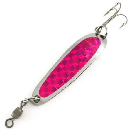 Estampillée des marques « LUHR JENSEN » et « KROCODILE » sur son revers, cette cuillère ondulante de 1/3 oz (10 g) est un outil polyvalent pour le lancer et la traîne. Le corps en laiton de forte épaisseur mesure 5,5 cm (2 1/4 pouces) de long, offrant un profil compact qui fend l'air pour des lancers à longue distance. Ce modèle particulier, identifié par le code produit 6505, présente une finition en nickel poli accentuée par une bande prismatique rose vif sur la face avant, conçue pour maximiser les reflets. Des composants de haute qualité caractérisent ce leurre fabriqué aux États-Unis, notamment un émerillon baril fixé à l'anneau brisé avant pour limiter la torsion de la ligne et un hameçon triple piquant et robuste à la queue. L'état de ce spécimen est de 5/5, les surfaces réfléchissantes et la bande prismatique restant éclatantes et l'armement ne montrant aucun signe d'utilisation.