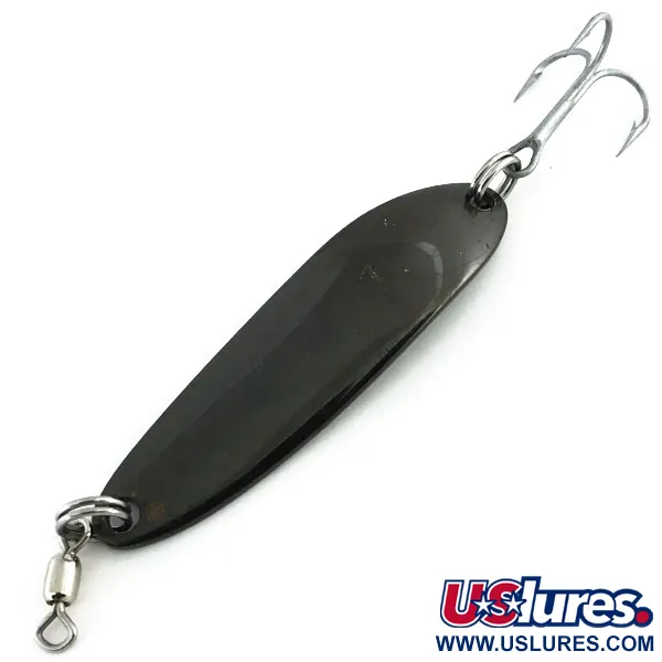 Le marquage sur le côté convexe intérieur identifie cette cuillère comme un véritable produit Luhr Jensen issu de l'usine de Hood River, dans l'Oregon. Mesurant 5,5 cm (2 1/4"), ce spécimen porte l'estampille 'Die #3' et affiche un poids de 10 g (1/3 oz), convenant aussi bien au lancer qu'à la traîne. La finition noire unie offre une silhouette distincte, constituant un choix tactique pour les pêcheurs ciblant les poissons par faible luminosité ou dans des eaux troubles. Cette pièce vintage, code produit 8775, est dans un état inutilisé, noté 5/5. L'armement d'origine comprend un hameçon triple argenté fixé par un anneau brisé et un émerillon baril à l'attache pour limiter le vrillage de la ligne lors de la récupération. Le corps métallique lourd et étroit est conçu pour augmenter la distance de lancer tout en maintenant une nage oscillante régulière.