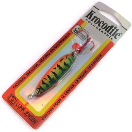 Une finition Holographic Green Tiger saisissante définit cette cuillère Krocodile, arborant de larges barres verticales noires sur un dégradé vert et jaune éclatant. Conçue pour des applications polyvalentes comme le lancer, la traîne et la dandinette, ce modèle porte le code produit spécifique 1018-038-1347. Pesant 1/2oz (14g) pour une taille de 2 1/4" (5,5cm), le leurre possède un corps étroit en métal embouti épais qui favorise les distances de lancer. L'emballage d'origine souligne l'héritage de Luhr Jensen de Hood River, dans l'Oregon, et mentionne le X-Treme Holographic Flash. Cette cuillère est équipée d'un hameçon triple VMC Sure Set et inclut un hameçon Siwash supplémentaire dans le blister, apprécié des collectionneurs et des pêcheurs pour s'adapter aux différentes réglementations. La surface métallique est conçue pour refléter la lumière même par faible visibilité. Ce spécimen est neuf, scellé dans son emballage d'origine, et présente un état de conservation 5/5.
